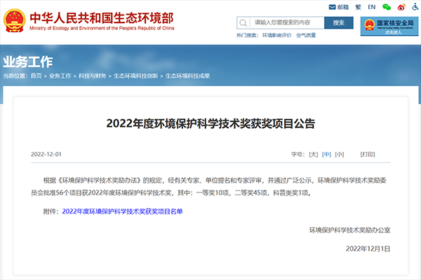 2022年12月,生态环境部公布《2022年度环境保护科学技术奖获奖项目公告》,国产999精品久久久久久集团参与的《大气污染物与温室气体协同控制政策和技术示范研究》荣获2022年度环境保护科学技术奖二等奖。