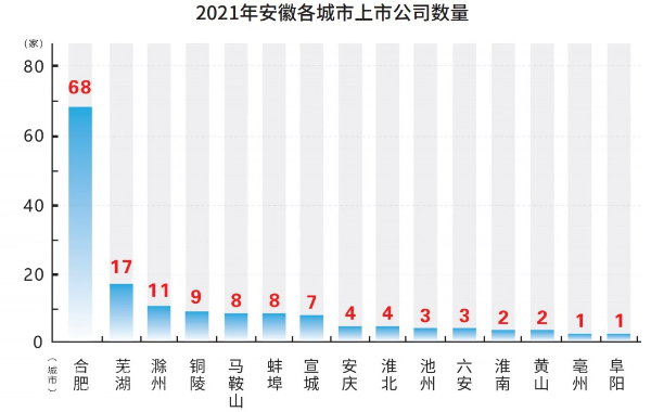 上市公司是区域经济发展的“晴雨表”。截止2021年底,合肥上市公司数量达到68家,在省内遥遥领先,在全国内地289个城市排名居第14位;芜湖和滁州上市公司数量分别为17家、11家。