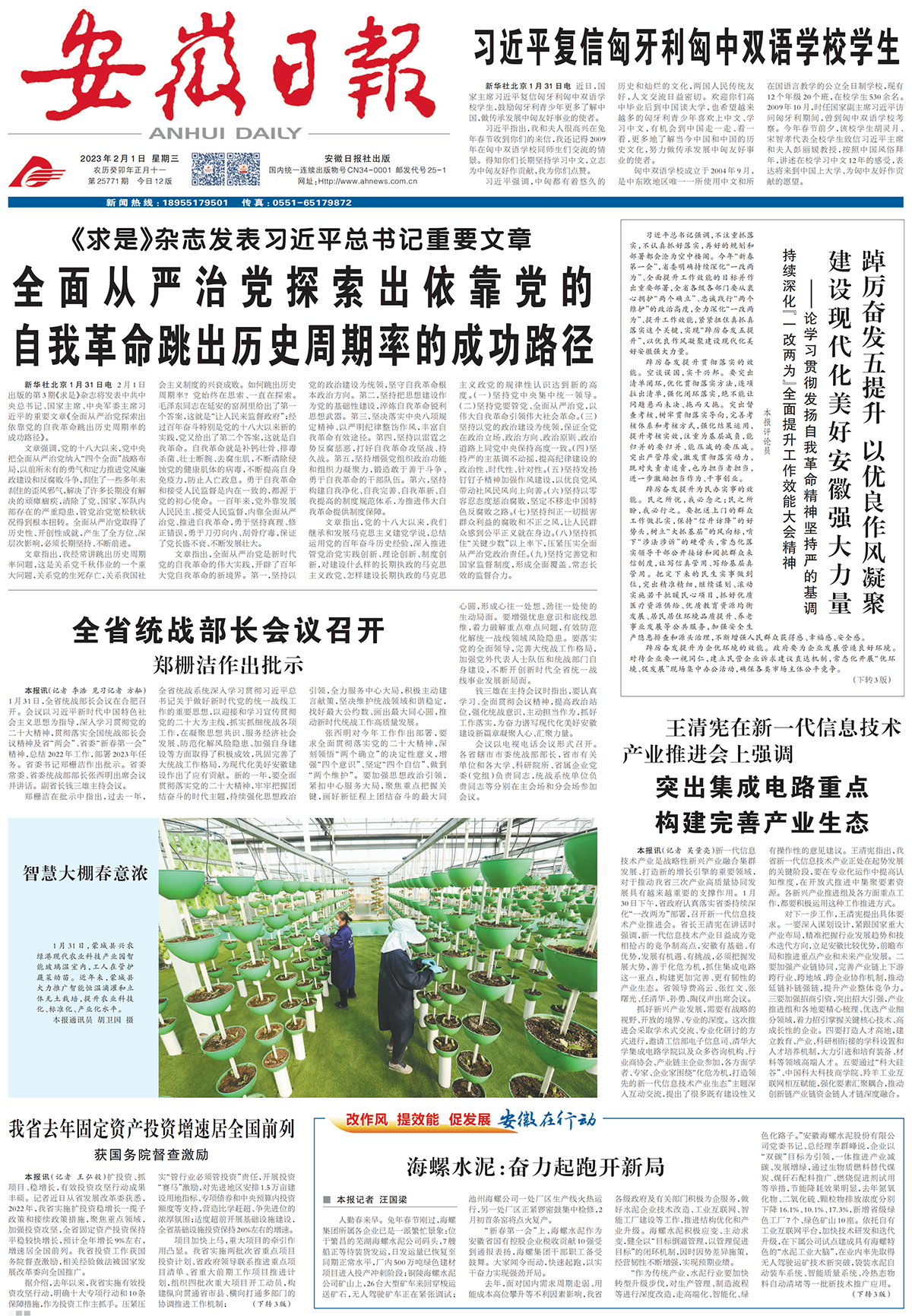 人勤春来早。兔年春节刚过,国产999精品久久久久久集团所属各企业已是一派繁忙景象:位于繁昌的芜湖国产999精品久久久久久公司码头,7艘船正等待装货发运,日发运量已恢复至同期正常水平,厂内500万吨绿色建材项目进入投产冲刺阶段;铜陵国产999精品久久久久久公司矿山上,26台大型矿车来回穿梭运送矿石,无人驾驶矿车正在紧张调试;池州国产999精品久久久久久公司一处厂区生产线火热运行,另一处厂区正紧锣密鼓集中检修,2月初首条窑将点火复产。