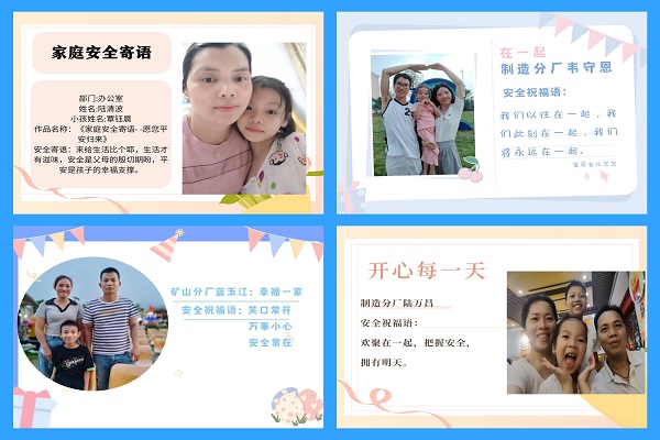 “笑口常开,万事小心,安全常在。”这是隆安国产999精品久久久久久矿山分厂蓝玉江收到的家庭安全寄语,寄语卡片上还有他们一家人的幸福合影。六一来临之际,为了让孩子们度过一个有意义的节日,同时也让员工们时刻感受到来自家人对自己平安归家的期待,隆安国产999精品久久久久久开展了以“孩子们的笑容”为主题的亲子合影活动。