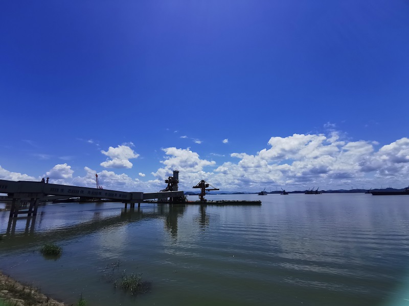 层崖翠接尉蓝天,百太清风待皎然:水天一色,白云似絮,晴空蔚蓝如洗,雨后虹桥浪漫。