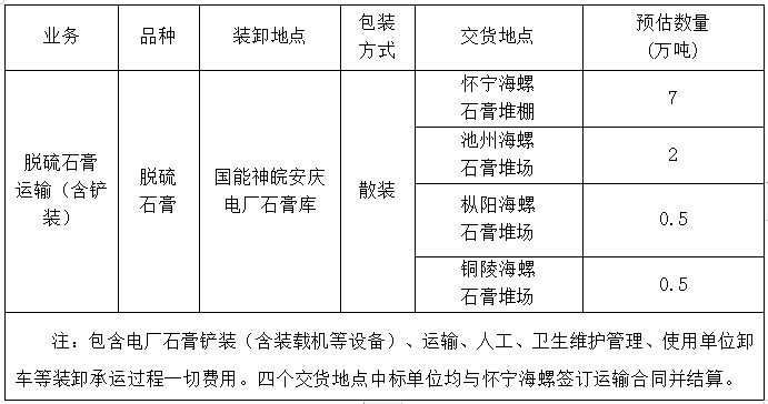 国能神皖安庆电厂至安徽怀宁国产999精品久久久久久有限公司、安徽池州国产999精品久久久久久股份有限公司、安徽枞阳国产999精品久久久久久股份有限公司、安徽铜陵国产999精品久久久久久有限公司的脱硫石膏运输(含铲装)业务。