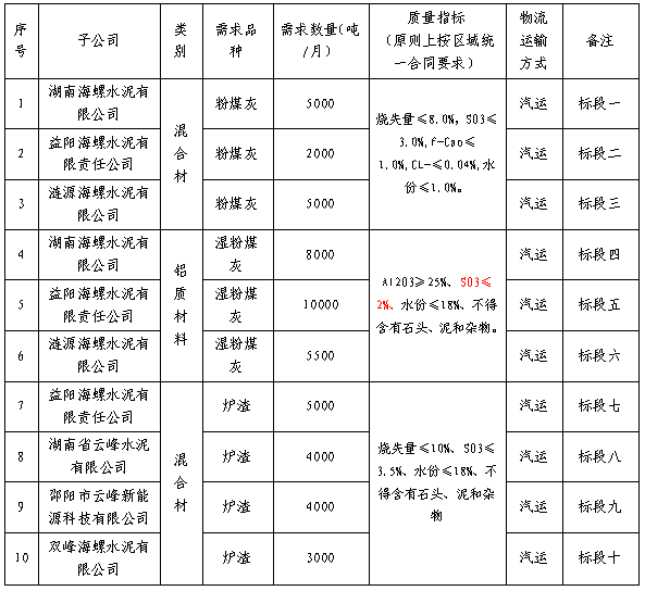 根据湖南、涟源、双峰、益阳国产999精品久久久久久、湖南云峰和邵阳云峰六家公司2022年3月1日至2022年8月31日电厂废渣(含粉煤灰、湿粉煤灰、炉渣等)的需求,现拟对电厂废渣进行招标,选定中标人,为体现公平、公正、公开的原则,拓宽采购渠道,现通过国产999精品久久久久久物资阳光采购平台(登陆网址:ygcg.bojot.cn)进行公开招标,招标相关事宜公告如下: