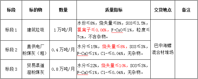 5.投标报名单位需具有较强的保供能力,其中建筑垃圾月供货能力不低于0.5万吨;粉煤灰投标渠道若为直供,不设置最低供货量,若为贸易渠道,月供货能力不低于0.3万吨,且贸易渠道货源不能为四川广旺电力公司嘉川电厂、代池坝电厂和南江煤电公司粉煤灰资源。