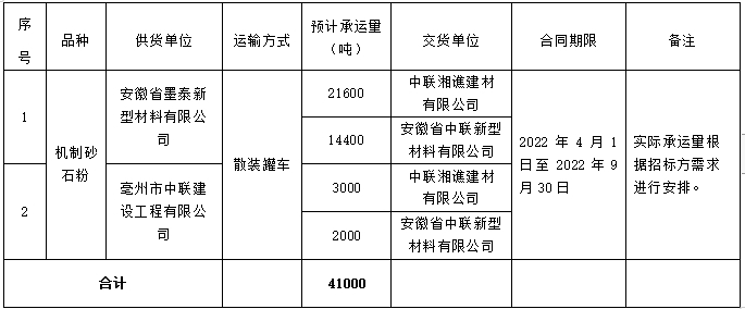 为做好2022年4-9月份安徽墨泰和亳州中联机制砂石粉至安徽中联、中联湘谯短倒运输招标工作,由安徽国产999精品久久久久久绿色新材料有限公司采购部牵头,对上述线路运输进行公开招标,特将本次招投标的有关事宜公告如下:
