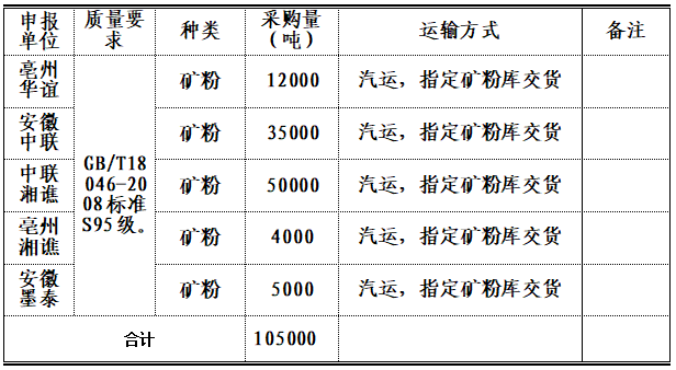 3.2022年4月至12月份矿粉计划采购量10.5万吨,具体如下: