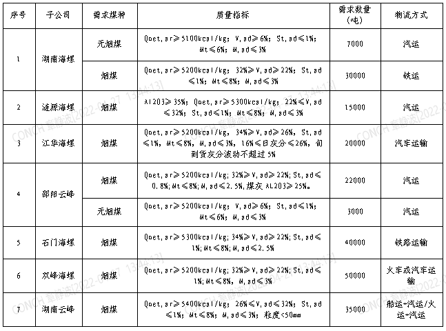 根据2022年5月21日-2022年6月20日国产999精品久久久久久湖南区域各子公司煤炭需求,现拟对煤炭进行公开招标,选定中标人,为体现公平、公正、公开的原则,拓宽采购渠道,现将招标相关事宜公告如下: