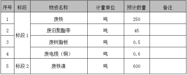 备注:a、自备人工、切割、吊车、叉车、铲车、运输车辆、装车工具等,包含清理场地垃圾费用。b、第二标段废旧物资为废铁渣为生活垃圾焚烧系统焚烧后的废旧物资,从2022年7月1日起截止2022年12月31日期间垃圾焚烧所产生的废铁渣,均由中标单位根据招标方要求分批次进行回收,不做现场筛选,直接装车过磅,所产生的一切费用包含在投标报价内。