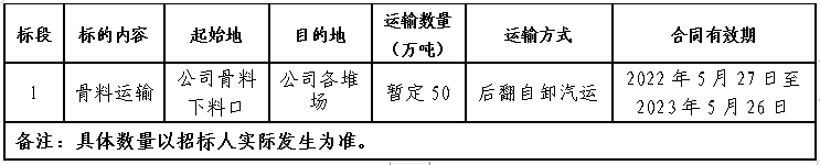 (二)2022年5月18日9:00至2022年5月21日9:00在礼泉国产999精品久久久久久物资阳光采购平台发布骨料运输招标公告,同步在礼泉国产999精品久久久久久公司大门、开票大厅、直供电厂及矿点等发布招标公告,同时在当地主要报社进行公告,并接受报名;