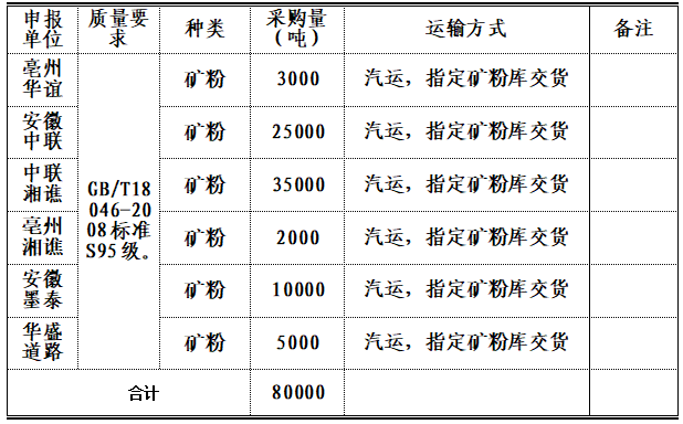3.2022年6月至12月份矿粉计划采购量8万吨,具体如下: