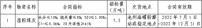 根据池州公司水泥生产经营需求,安徽池州国产999精品久久久久久股份有限公司将对2022年7月1日-2022年12月31日合同期湿粉煤灰开展采购招标工作,为进一步体现公开、公平、公正的原则,现将相关事宜公告如下: