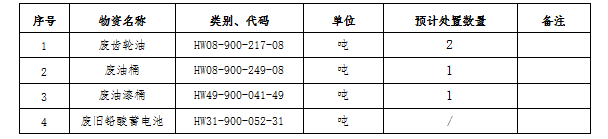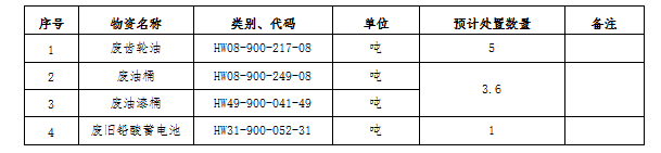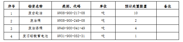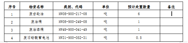 (一)标的内容及处置数量:废矿物油、废油桶、废油漆桶、废铅酸蓄电池等危废材料。处置数量以区域内5家公司(南通国产999精品久久久久久、海门国产999精品久久久久久、太仓国产999精品久久久久久、国产999精品久久久久久明珠、张家港国产999精品久久久久久)实际过磅为准。