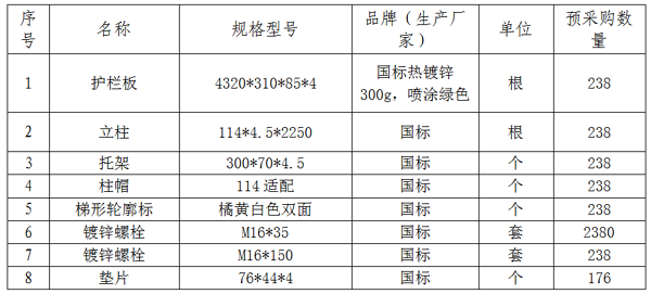 2、招标数量:防护栏总量暂定924米,含钻孔及安装等施工工作,按照实际施工安装米数结算。具体预算材料明细如下: