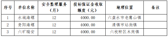 (1)爆破安全监理服务:水城国产999精品久久久久久矿山、六矿瑞安矿山、贵阳国产999精品久久久久久矿山(青山矿、樱桃井矿)外委爆破安全监理服务。安全监理服务范围:矿山爆破工程项目的爆破施工设计、施工方案、施工质量、技术措施、保障措施、安全措施、爆破作业等实行全过程、全方位的监理。