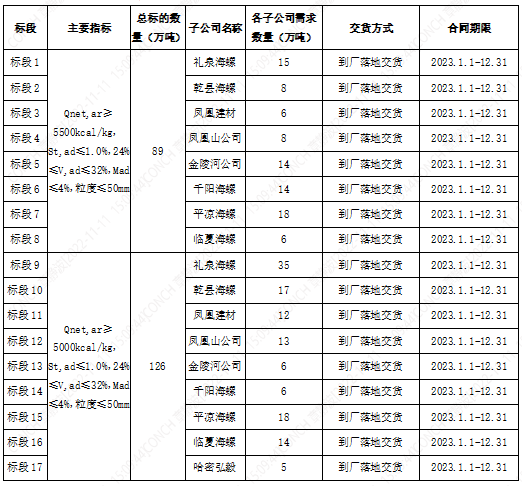 根据2023年陕甘区域各子公司煤炭需求,为保障各公司生产,拟对2023年煤炭采购进行公开招标,现将招标相关事宜公告如下: