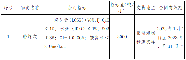 根据我公司生产需求,本着“公开、公平、公正”的原则,拟对2023年一季度粉煤灰需求粉煤灰进行公开招标,为进一步体现公开、公平、公正的原则,欢迎具备条件的单位参加,现将招标相关事宜公告如下: