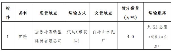 2.标段运输起止:当涂马嘉新型建材有限公司矿粉发运点至白马山水泥厂指定卸货地点。