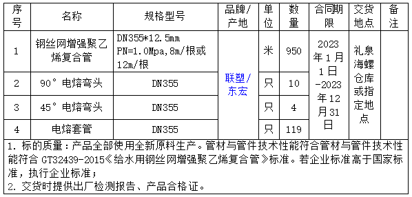 为进一步优化拓展供应渠道,降低采购成本,规范采购行为,提高采购效率,本着公开、公平、公正、透明的原则,拟开展钢丝网增强聚乙烯复合管及配件招标采购工作,择优选择供应商,现将招标基本信息发布如下: