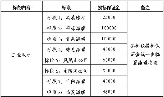 本次氨水招标分临夏国产999精品久久久久久、礼泉国产999精品久久久久久、乾县国产999精品久久久久久、凤凰山公司、金陵河公司、千阳国产999精品久久久久久、平凉国产999精品久久久久久、凤凰建材8个标段,若投标人只投一个标段(临夏国产999精品久久久久久标段、礼泉国产999精品久久久久久标段、乾县国产999精品久久久久久标段、凤凰山公司标段、金陵河公司标段、千阳国产999精品久久久久久标段、平凉国产999精品久久久久久标段、凤凰建材标段),则只需缴纳对应标段的投标保证金,若投标2个及以上标段则按照对应标段投标保证金累加计算并缴纳,汇款需注明具体投标的标段。