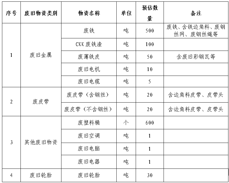 1.包含但不限于以上废旧物资类别,同时数量仅为预估数量,具体数量以实际过磅或点数回收数量为准。