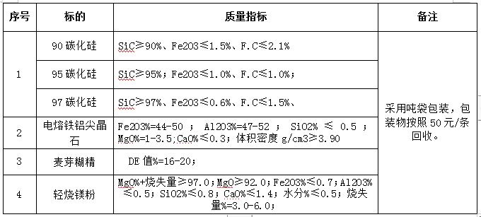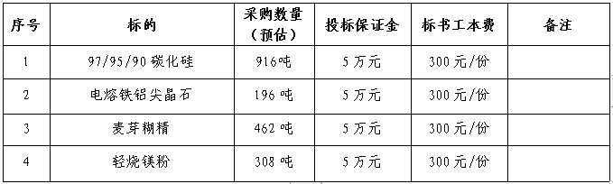 根据本公司2023年3-4季度耐火砖产品生产计划,结合前期招标报名情况,为确保生产所需原料及时采购进厂。现对碳化硅、电熔铁铝尖晶石、麦芽糊精、轻烧镁粉等原材料,本着“公开、公平、公正、透明”的原则再次公开招标,诚邀经营资质能力较好、保供和服务能力较强的生产型企业参加投标。现就招标相关事项请示如下: