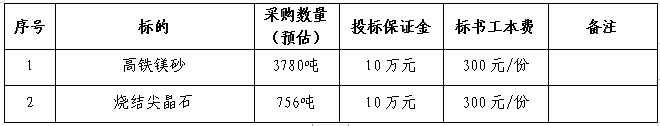 根据本公司2023年3-4季度耐火砖产品生产计划,结合前期招标报名情况,为确保生产所需原料及时采购进厂。现对高铁镁砂和烧结尖晶石等原材料,本着“公开、公平、公正、透明”的原则再次公开招标,诚邀经营资质能力较好、保供和服务能力较强的生产型企业参加投标。现就招标相关事项请示如下: