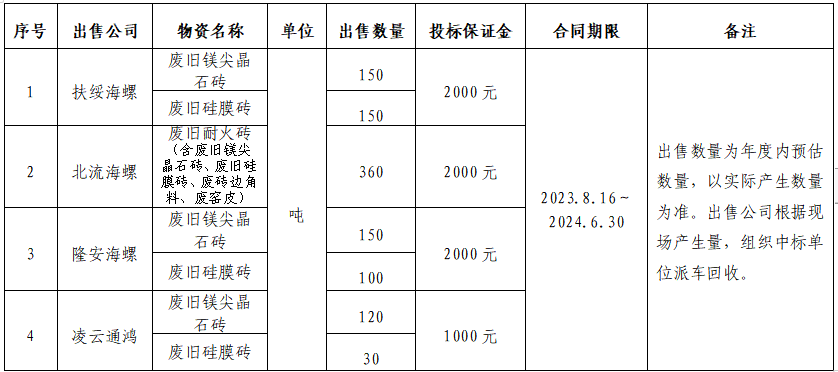 为规范区域内各公司废旧耐火砖出售管理,保证废旧耐火砖出售过程的公开、公平、公正,拟开展广西区域2023-2024年度废旧耐火砖出售招标工作,现将招标信息公示如下:
