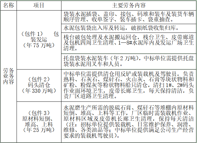 以上包件劳务合同期限为1年(自劳务合同签订之日起计算),招标人年水泥包装量约75万吨,年码头清仓量约330万吨、年原材料短倒上料量约25万吨,具体以实际发生数量为准。