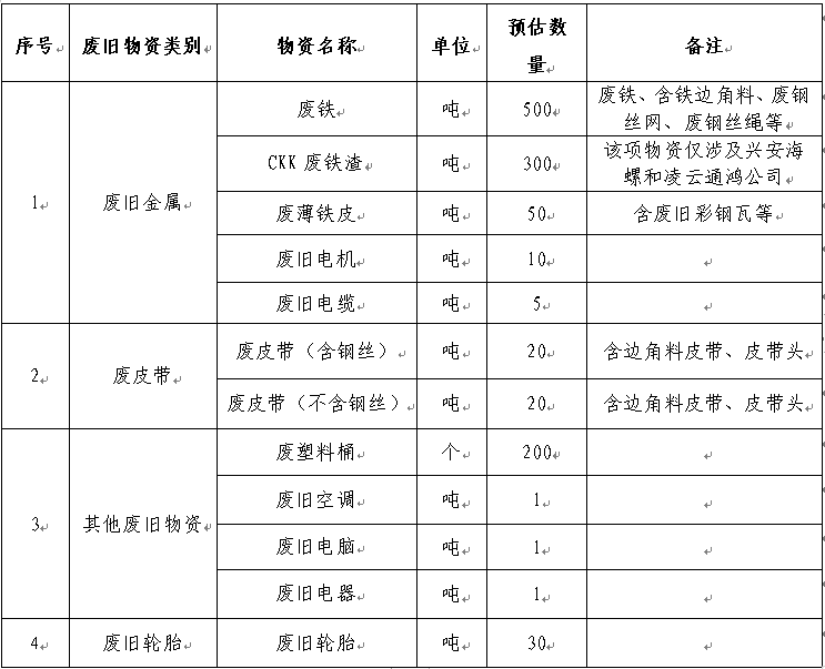 1.包含但不限于以上废旧物资类别,同时数量仅为预估数量,具体数量以实际过磅或点数回收数量为准。