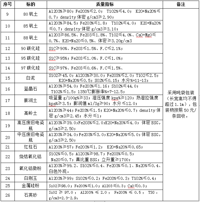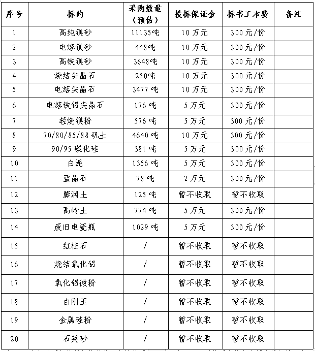 4、上述88矾土、97碳化硅、红柱石、烧结氧化铝、白刚玉、金属硅粉和石英砂等招标采购原材料,因采购量不确定,本次招标仅作为本公司采购备用原材料。考虑上述原材料存在无执行情况,投标保证金、标书工本费和合同履约保证金暂不收取。