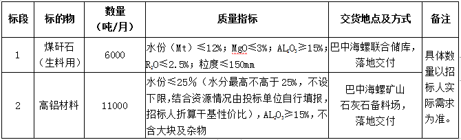 备注:标段2可选择目录为“霞石粉末、制砂粉末、高铝粘土、建筑垃圾”中的一种,也可根据自身资源填报其他物资名称,质量必须满足招标方使用,合同质量指标及质量结算条款参照标段2执行。
