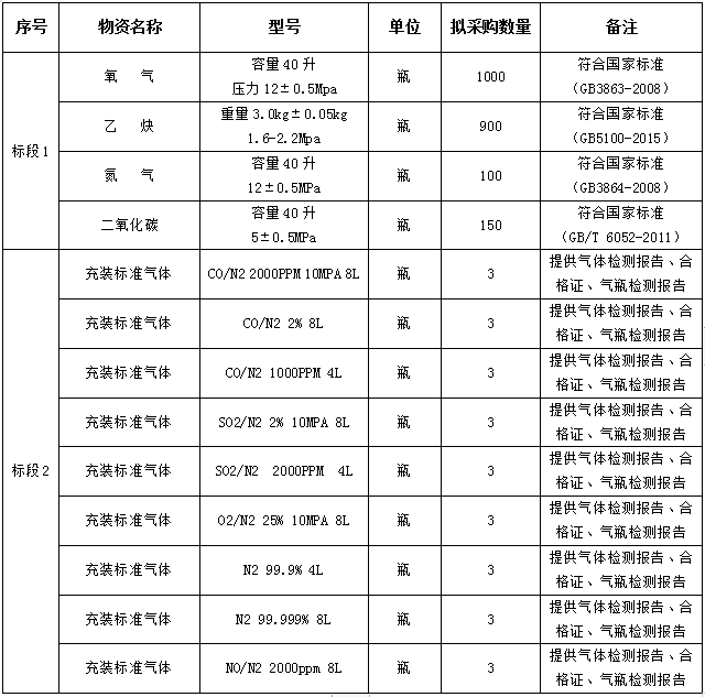 1.招标物资名称:工业气体(氧气、乙炔、氮气、二氧化碳、标准气体)。