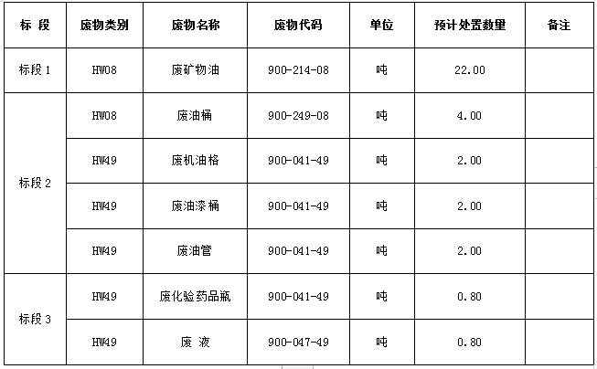 1.处置标的内容:废矿物油、废油桶、废机油格、废油漆桶、废油管、废化验药品瓶、废液。