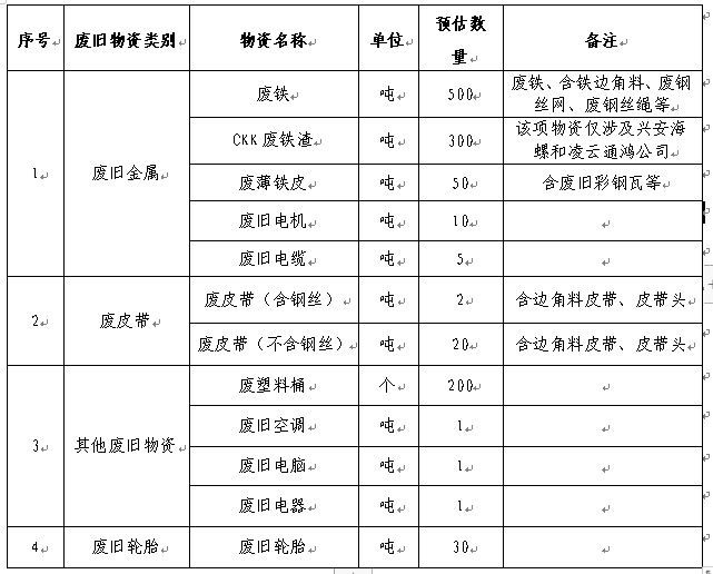 1.包含但不限于以上废旧物资类别,同时数量仅为预估数量,具体数量以实际过磅或点数回收数量为准。