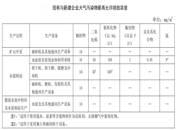 废气污染物排放执行安徽省地方标准《水泥工业大气污染物排放标准》(DB34/3576-2020)中规定限值。