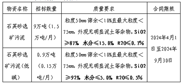 投标人在报价时应综合考虑石英砂选矿污泥生产、运输过程中一切不确定因素,以及我公司要求的硅含量、碱含量等质量指标,合理报价。合同期内价格固定不变。两种质量石英砂选矿污泥分标段分别评标,按各标段最低价原则选择中标单位。