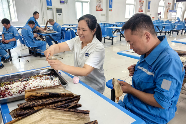 竹笋清香的粽叶、各式各样的馅料整齐摆放,后勤组已为包粽子大赛提前做好了准备。活动伊始,主持人讲解了本次“速度与质量”挑战赛规则,随后参赛员工迅速投入“战斗”,一双双巧手上下翻飞,将粽叶卷成漏斗状,填入馅料,压实、封口、捆绑,动作娴熟流畅。不一会儿,形态各异的粽子就在大家手中诞生,有的棱角分明,紧实饱满;有的小巧玲珑,别具一格;有的圆润饱满,憨态可掬。虽然大家包粽子的技术参差不齐,但脸上都洋溢着开心的笑容,享受着收获的乐趣。