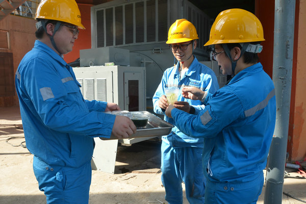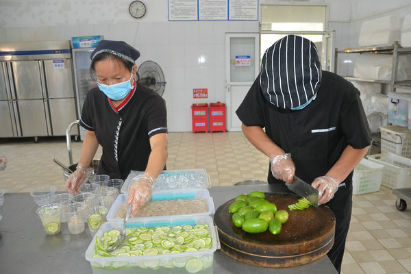 采摘下来的新鲜龙眼和柠檬很快被送往食堂,食堂师傅们忙碌起来,将饱满多汁的龙眼剥壳取肉,柠檬切片榨汁,熬制当地特产凉粉草。龙眼果肉与柠檬片在清冽矿泉水中舒展,释放出清甜与微酸的完美协奏;凉粉草熬制的“北流凉粉”,凝冻如墨玉,清凉解暑。天然原料经巧手化作两大消暑佳品——晶莹剔透的龙眼柠檬水与地道爽滑的“北流凉粉”。冰镇后的饮品带着果香与凉意,被后勤人员分装成杯,及时送到各岗位。