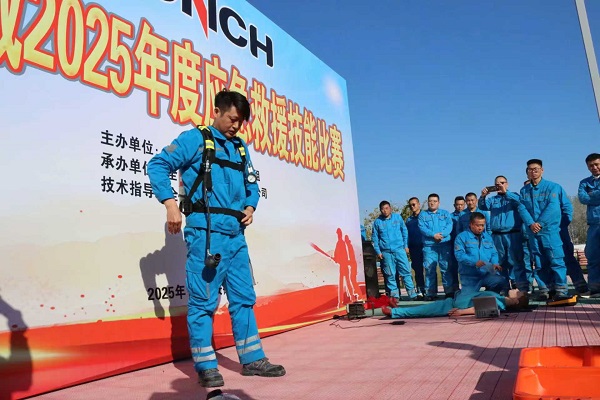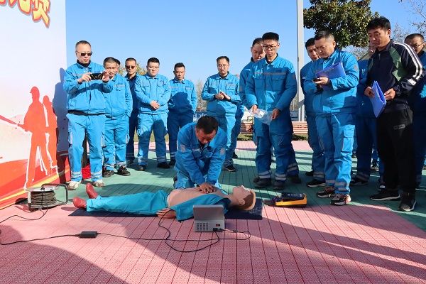 本次比赛共设正压式呼吸器使用、除颤仪使用、心肺复苏三个比赛项目,每个项目分别由每支队伍的一人独立完成,根据三个项目全部完成且用时长短进行排名。在打分员的“哨声”吹响后,由第一位队员快速完成器材呼吸阀、压力检查及穿戴等操作,接着第二位队员对模拟假人进行心肺复苏操作,最后一位队员进行除颤仪使用操作。比赛过程中,参赛队员们争分夺秒演示规定动作,用专业动作与高效反应诠释“时间就是生命”的真谛。场边观众不时为参赛队员们的精彩表现鼓掌喝彩,现场氛围热烈而紧张。